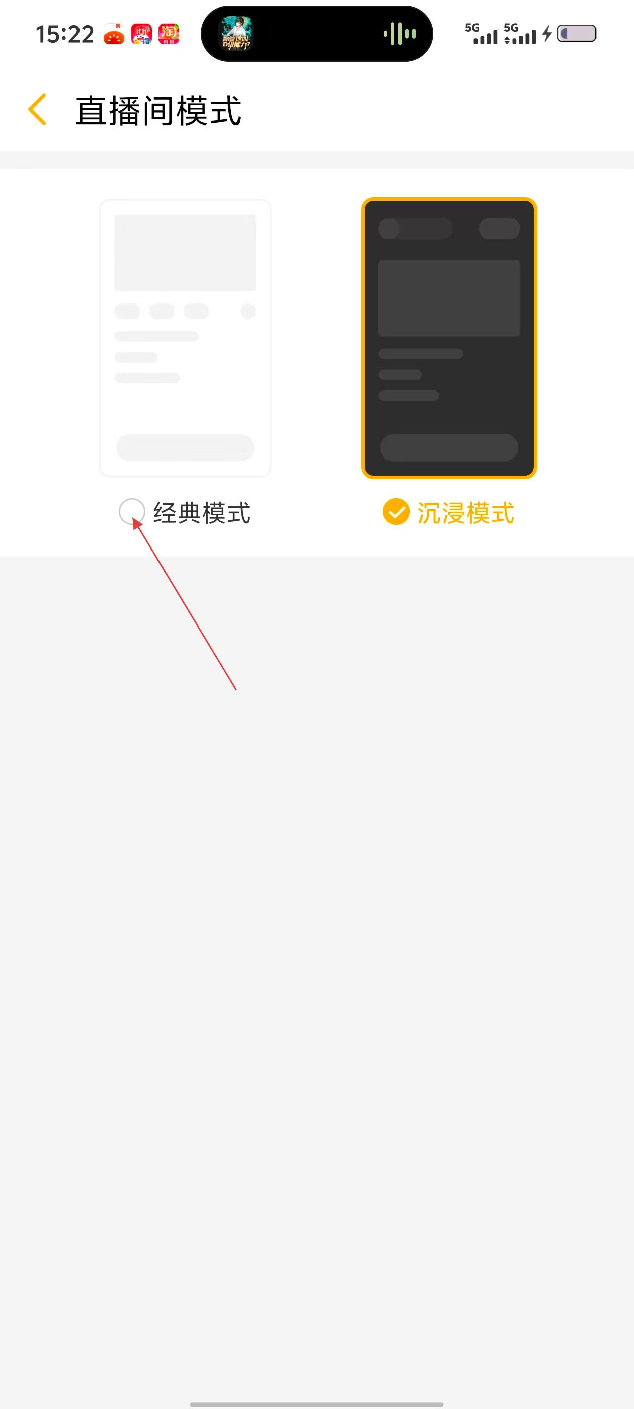 4、在【直播间模式】页,有【经典模式】和【沉浸模式】两种选择,可根据喜好点击对应选项切换直播间模式。