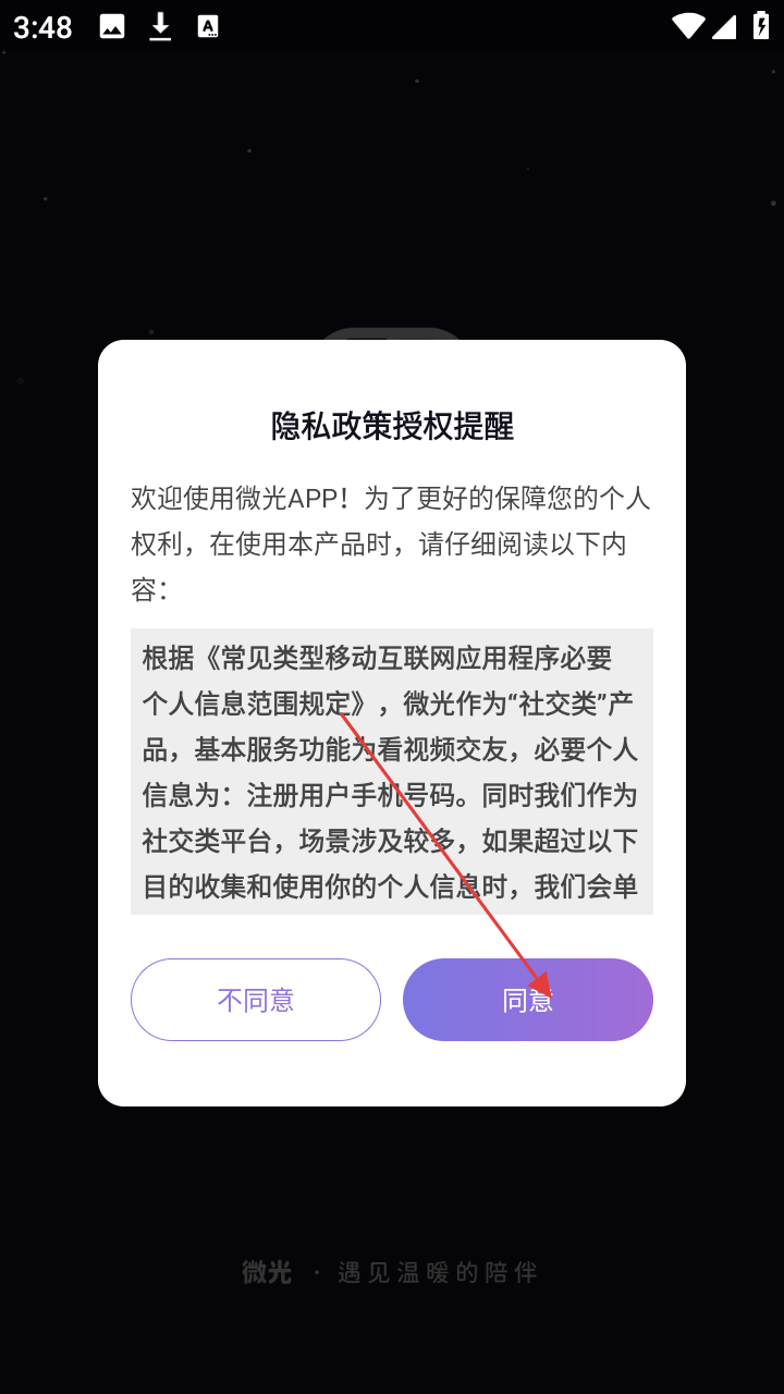1、打开微光APP,会弹出隐私政策授权提醒,仔细阅读后,点击【同意】按钮,进入登录页面。