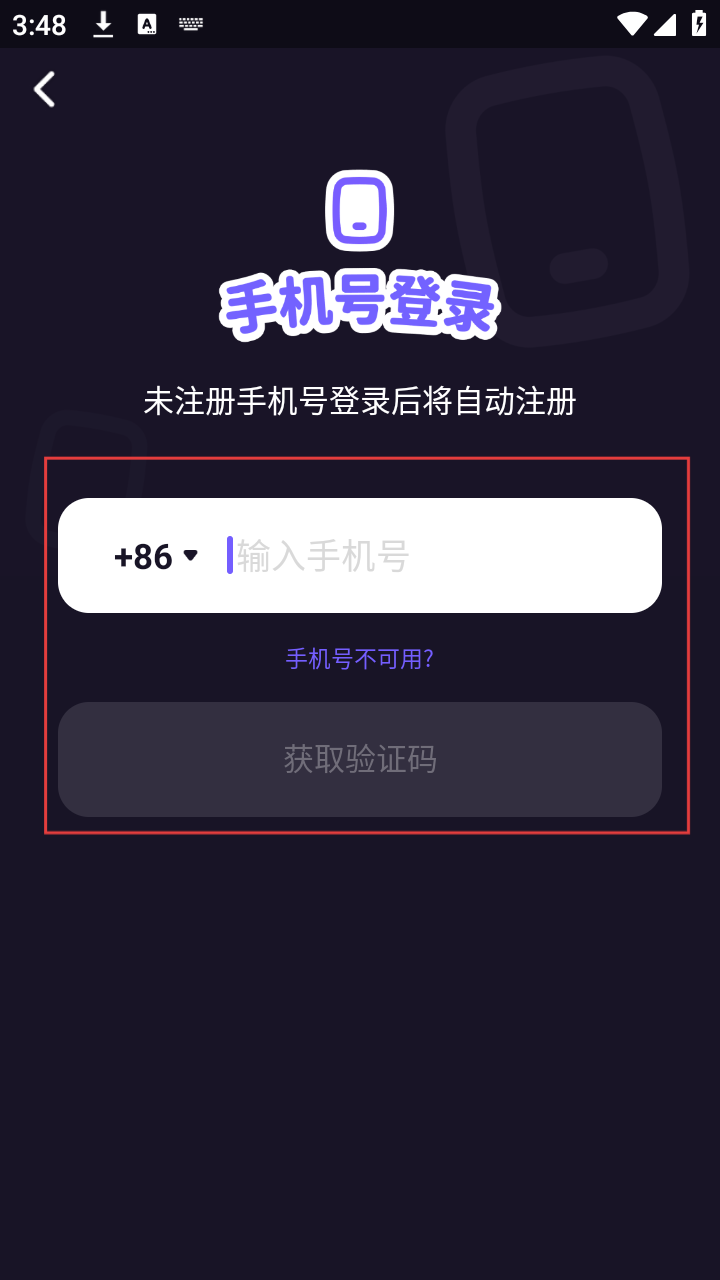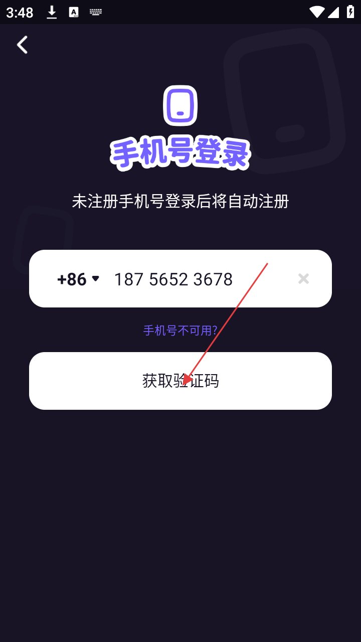 3、进入手机号登录页面,在输入框中输入要登录的手机号码,准备获取验证码。