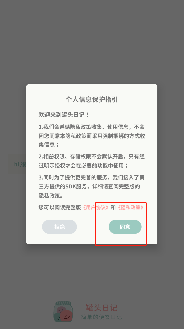 1、阅读并同意个人信息保护指引。点击“同意”按钮,继续使用应用。