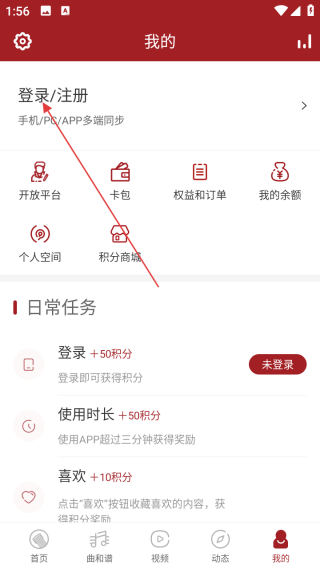 2、在我的界面点击登录/注册。