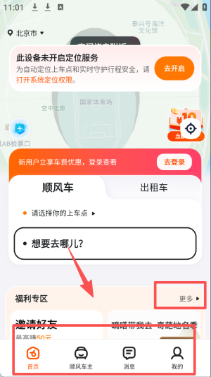 1、选择打车服务:点击“顺风车”或“出租车”选择打车服务。