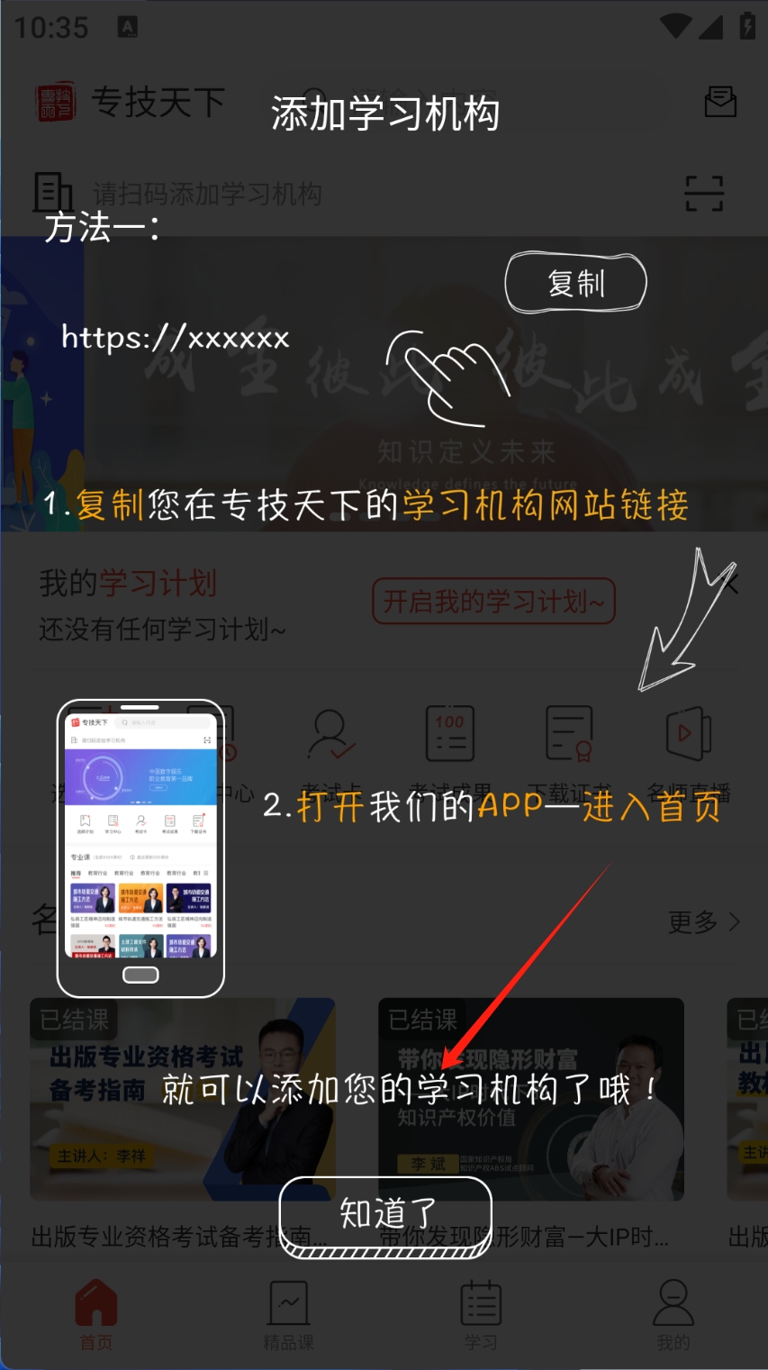 1、复制链接 打开APP并添加学习机构。