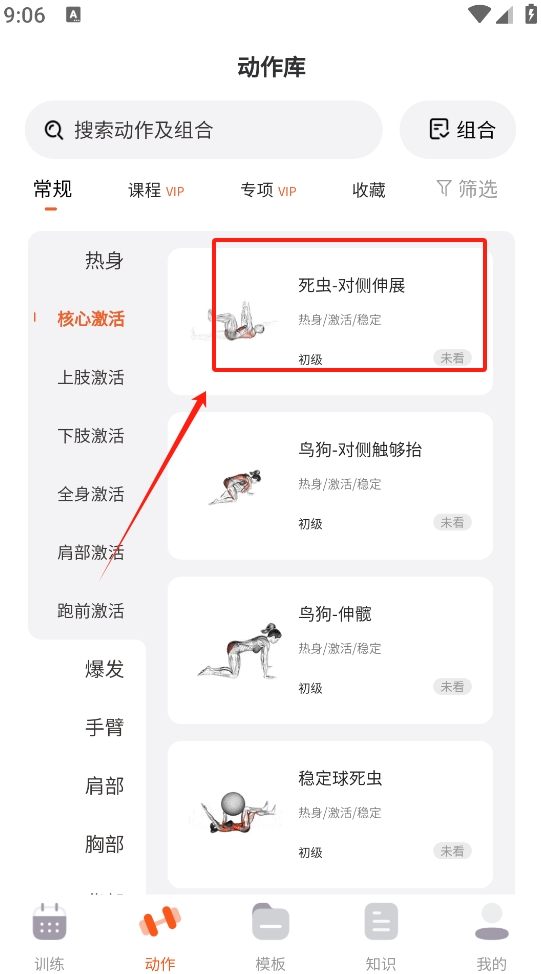 1、在动作库中找到“核心激活”分类,选择“死虫-对侧伸展”动作。