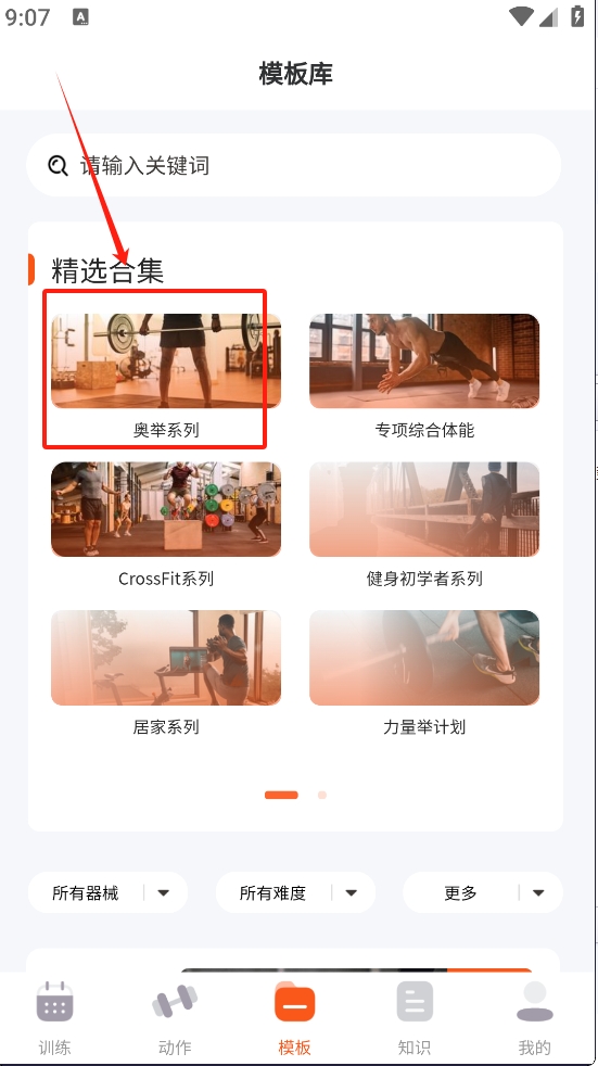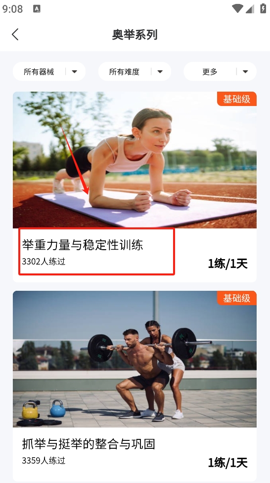 4、在奥举系列中选择“举重力量与稳定性训练”,查看训练计划和参与人数,开始训练。