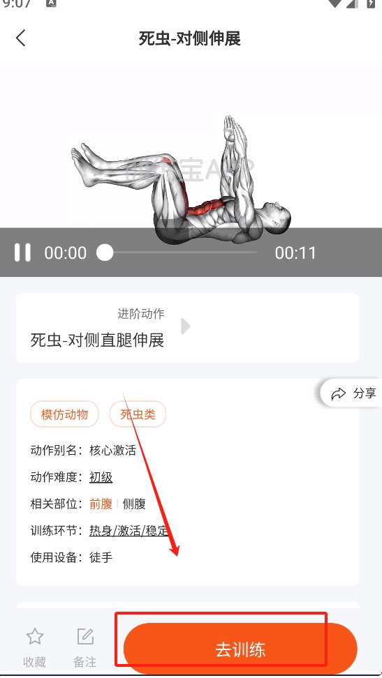 2、查看动作详情,了解动作难度、相关部位、训练环节和使用设备,点击“去训练”开始训练。