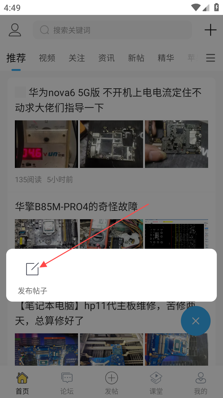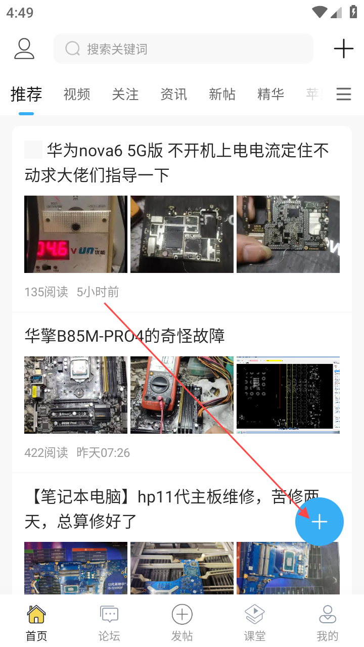2、进入论坛首页,点右下角蓝色【+】,弹出操作选项。