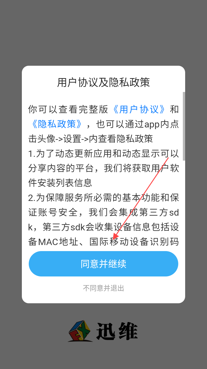 1、首次打开迅维,弹出【用户协议及隐私政策】,点【同意并继续】。