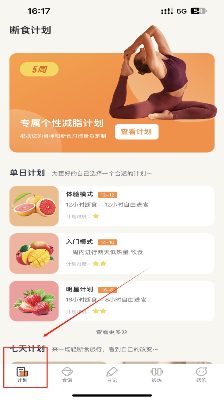 1、点击“计划”按钮,选择适合您的断食或饮食计划。