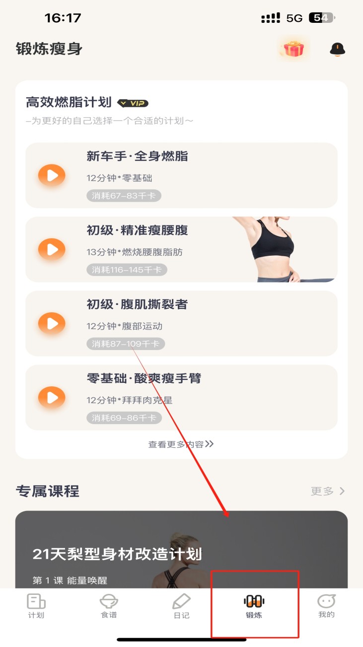 3、点击“锻炼”按钮,开始您的专属健身课程。