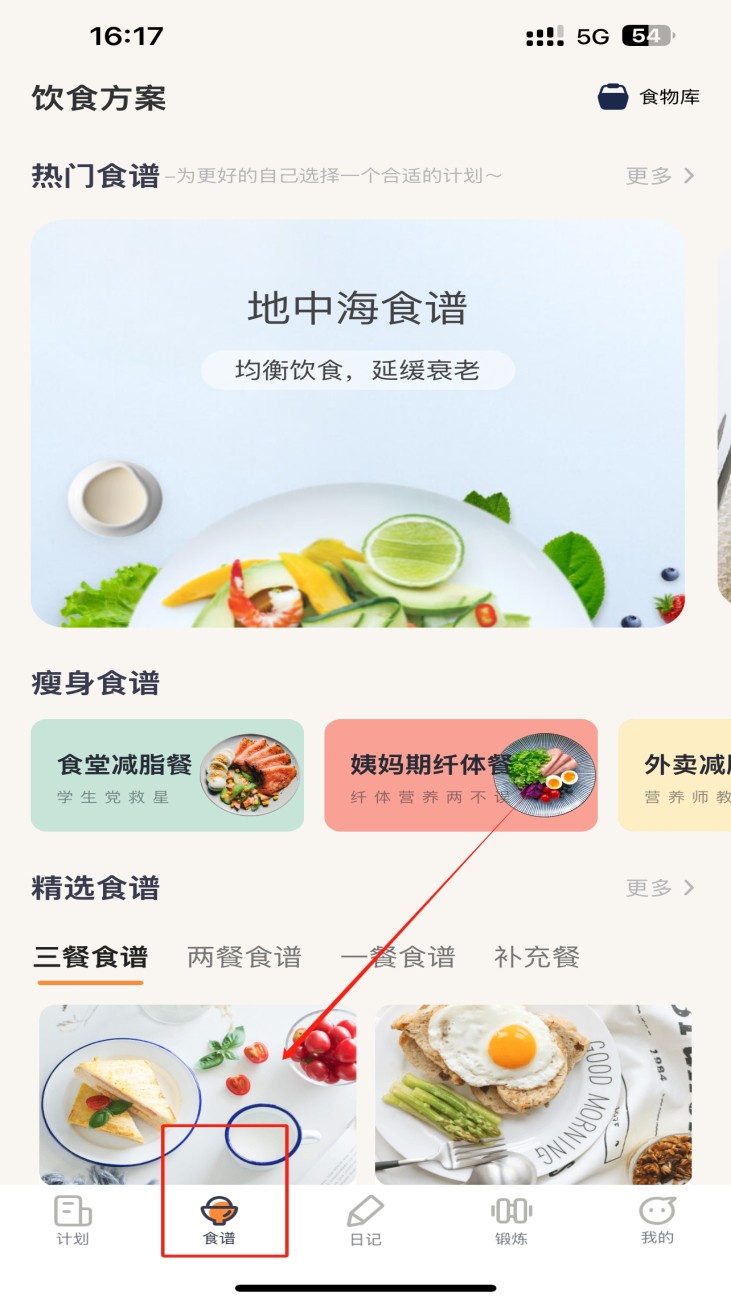 2、点击“食谱”按钮,浏览并选择健康饮食方案。