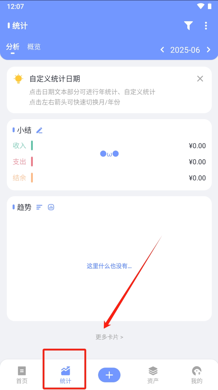 2、点击“统计”按钮,了解自定义统计日期和收入支出结余详情。