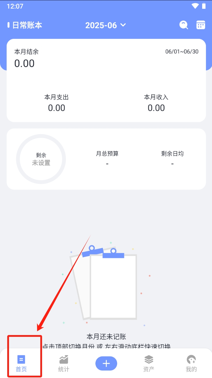 1、点击“首页”按钮,查看本月结余、支出和收入的总览信息。