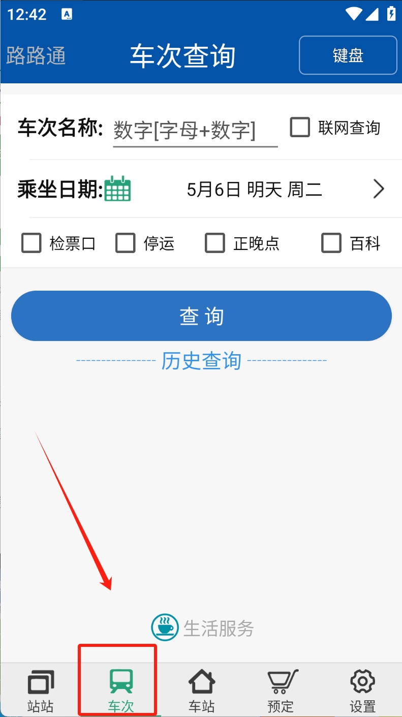 2、选择车次查询:点击“车次”图标,输入车次名称和乘坐日期进行查询。