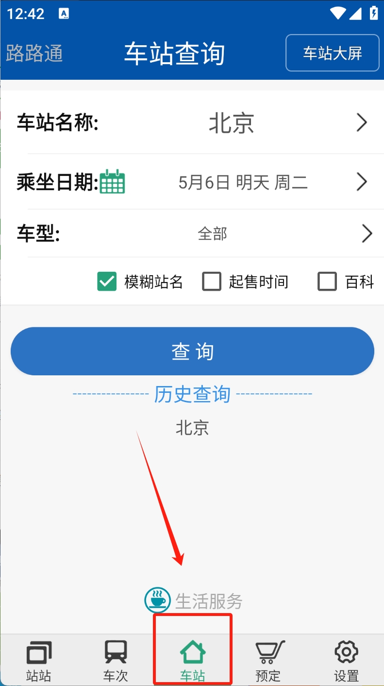 3、选择车站查询:点击“车站”图标,输入车站名称和乘坐日期进行查询。