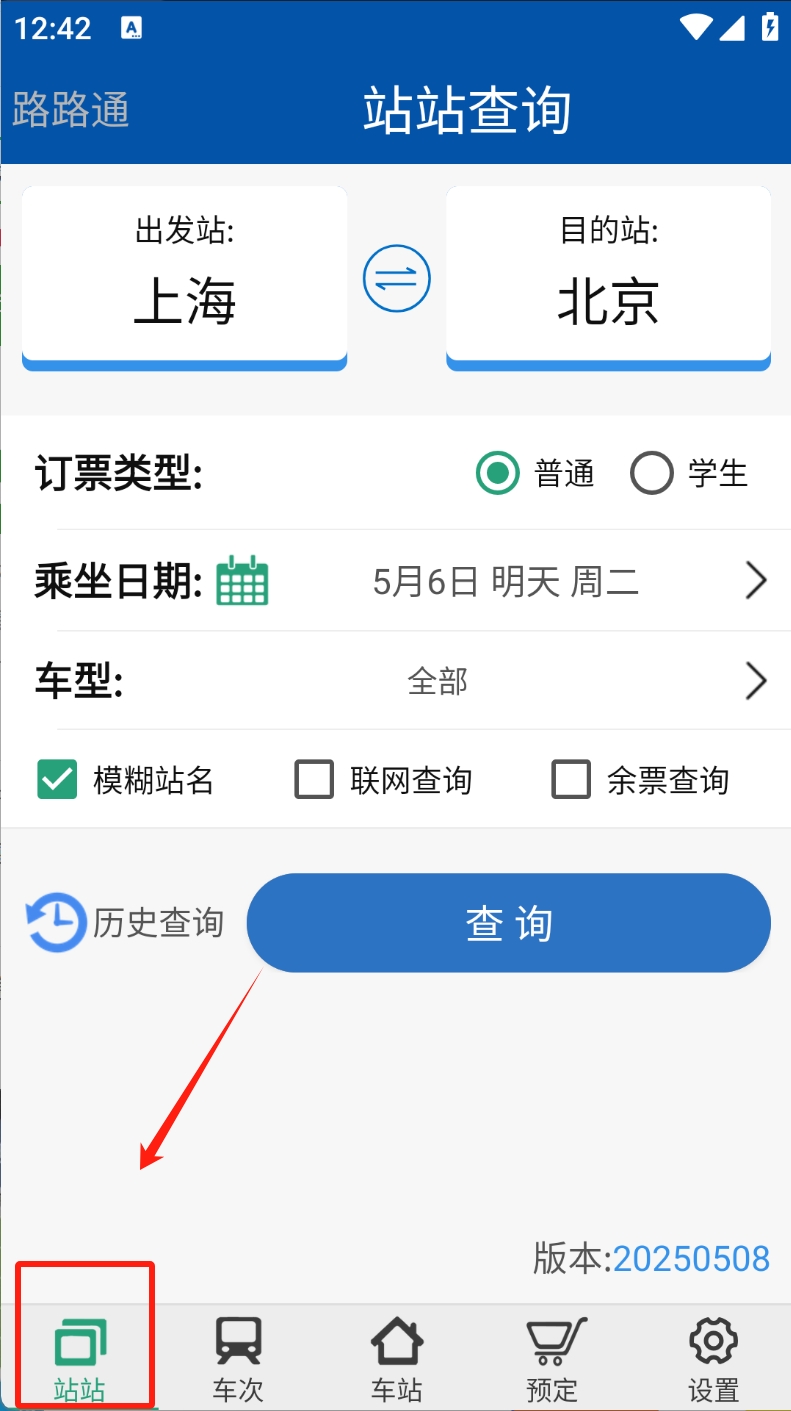 1、基础查询操作:打开APP后选择查询类型,输入出发站、到达站及日期,点击搜索即可获取符合条件的全部车次列表。