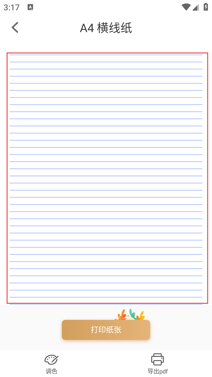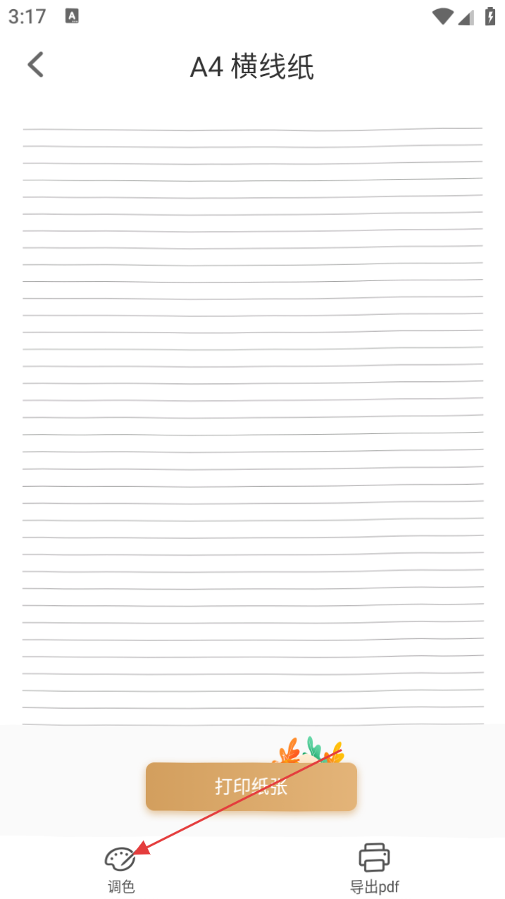 3、进入A4横线纸页面,若要调整纸张颜色,点击左下角的【调色】按钮。