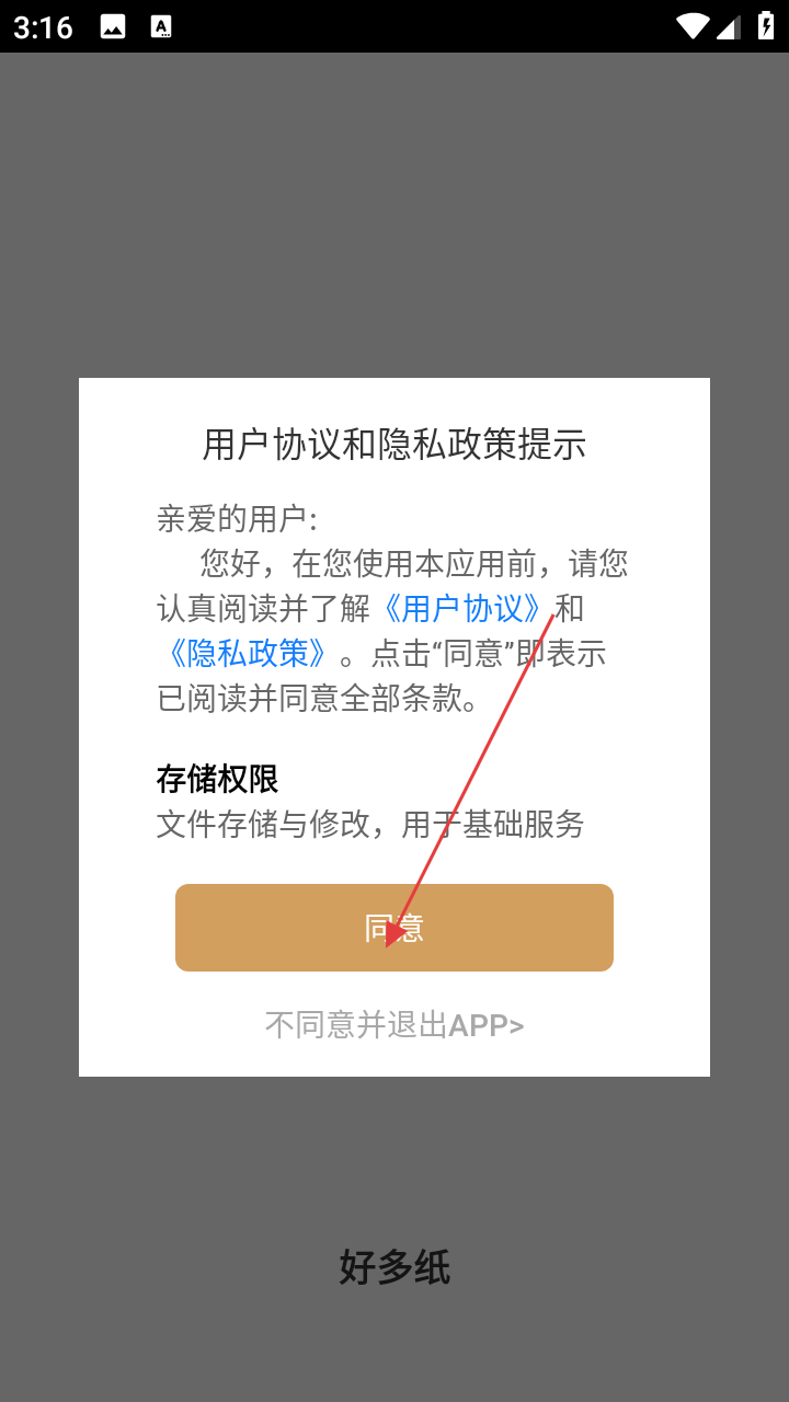 1、打开好多纸,若同意《用户协议》和《隐私政策》,点击【同意】按钮,即可进入软件。