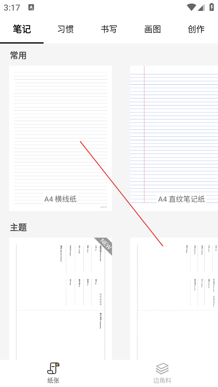 2、进入软件后,在“笔记”分类下,若要使用A4横线纸,点击【A4横线纸】选项。