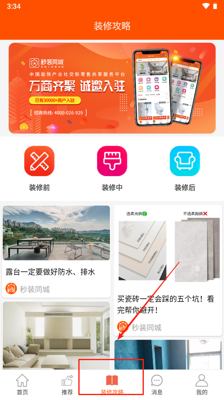 3、查看装修攻略。点击底部的“装修攻略”图标,获取装修知识和建议。