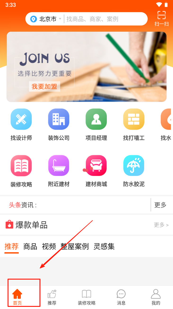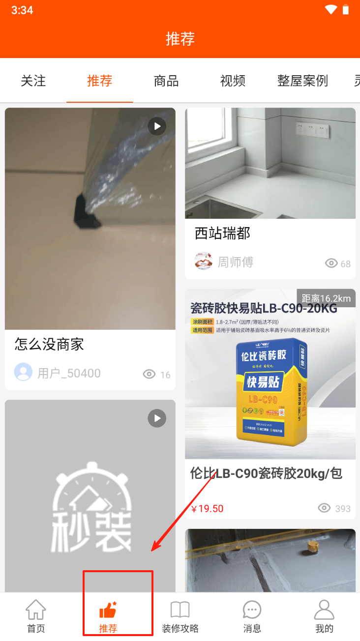 2、浏览推荐内容。在推荐页面,浏览各种装修相关的视频和商品。