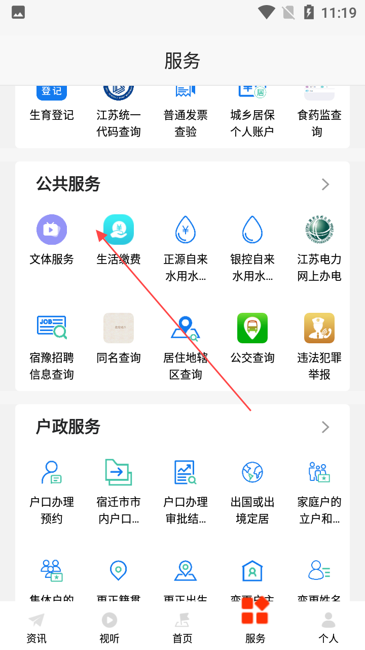 2、在服务页“公共服务”区,点【生活缴费】,进生活缴费页。