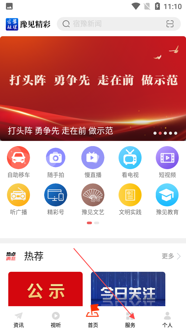 1、打开豫见精彩,在首页点底部【服务】,进入服务页。