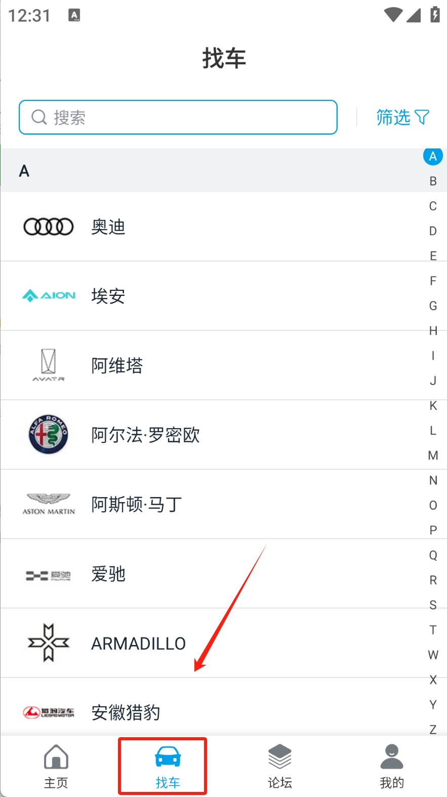 2、查找汽车品牌:点击底部导航栏的“找车”图标,搜索特定汽车品牌。