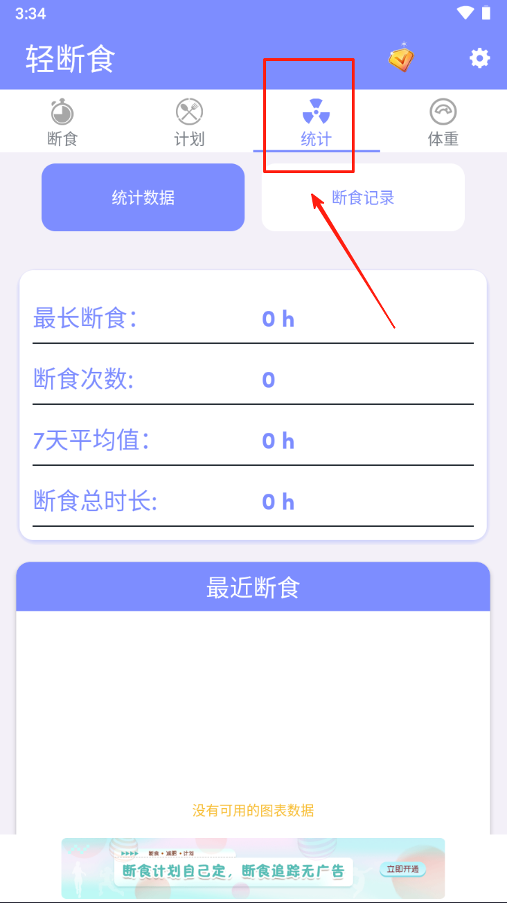 3、点击“统计”选项查看您的断食记录和统计数据。