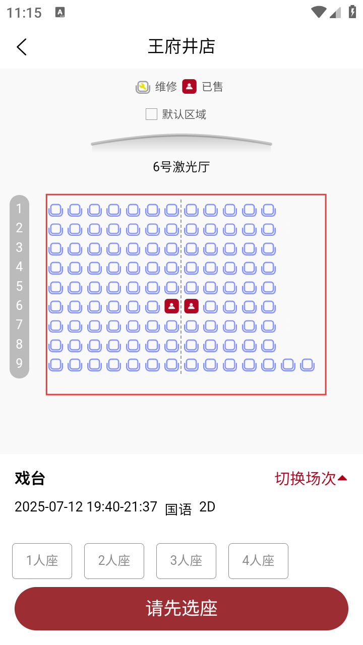 3、进入选座页,在“6号激光厅”选心仪座位,点击即可选中。