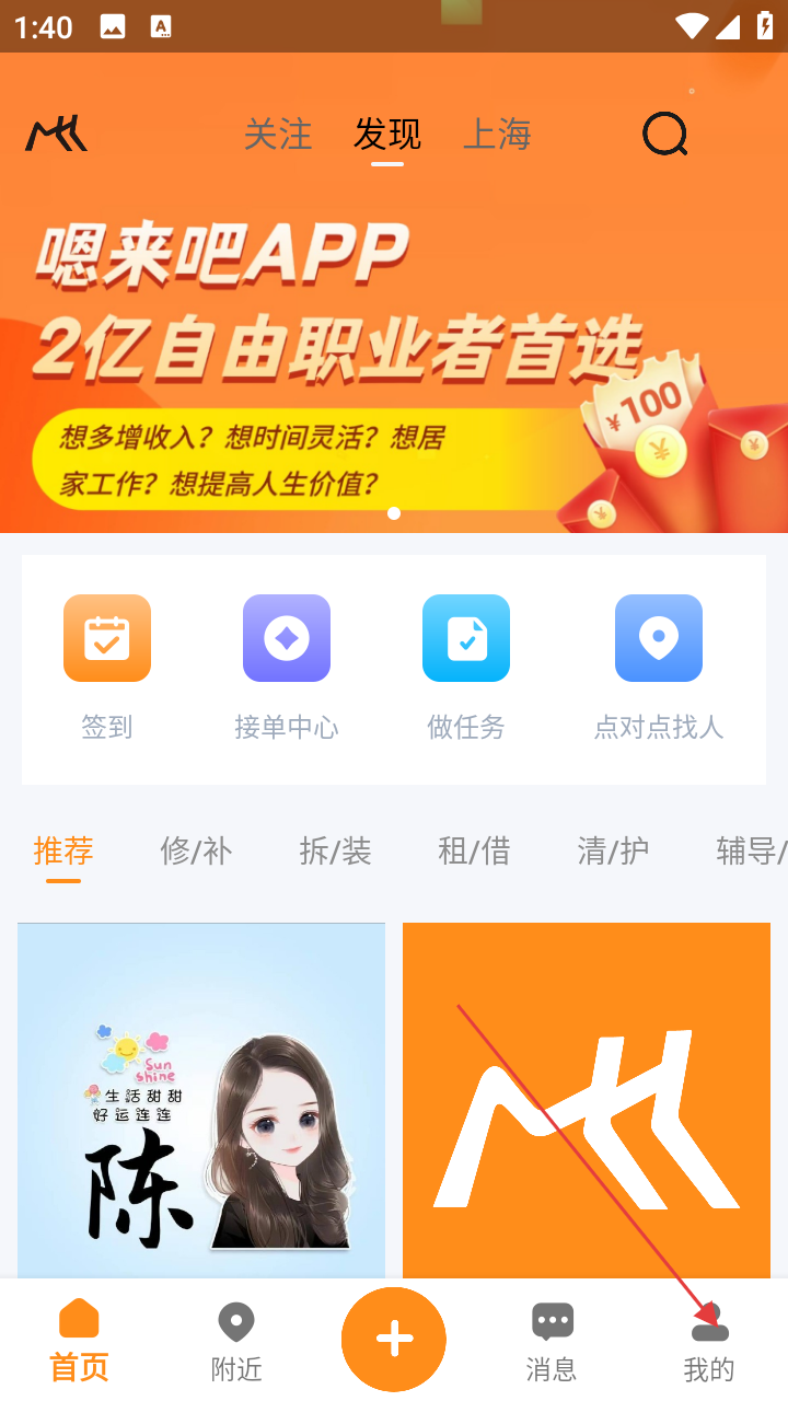 1、打开嗯来吧,进入首页后点击底部【我的】。