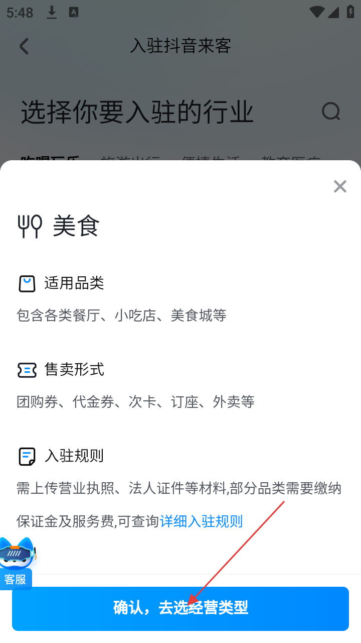 3、在美食行业详情页面,查看相关信息后,点击【确认,去选经营类型】按钮。