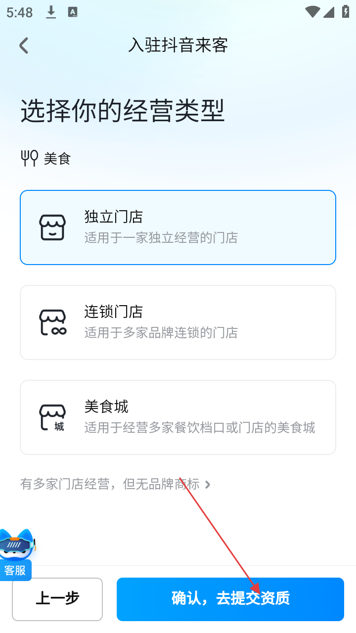4、在经营类型选择页面,选好经营类型后,点击【确认,去提交资质】按钮,进行资质提交。