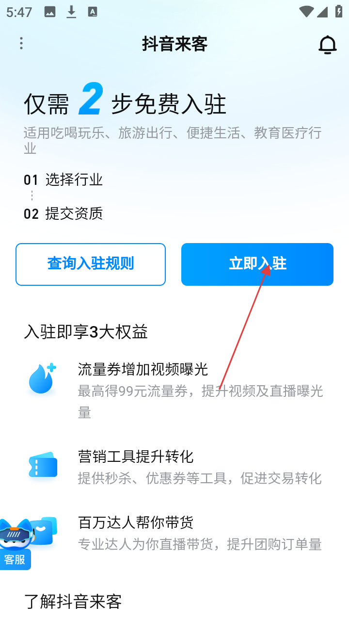 1、进入抖音来客页面,点击【立即入驻】按钮,开启入驻流程。