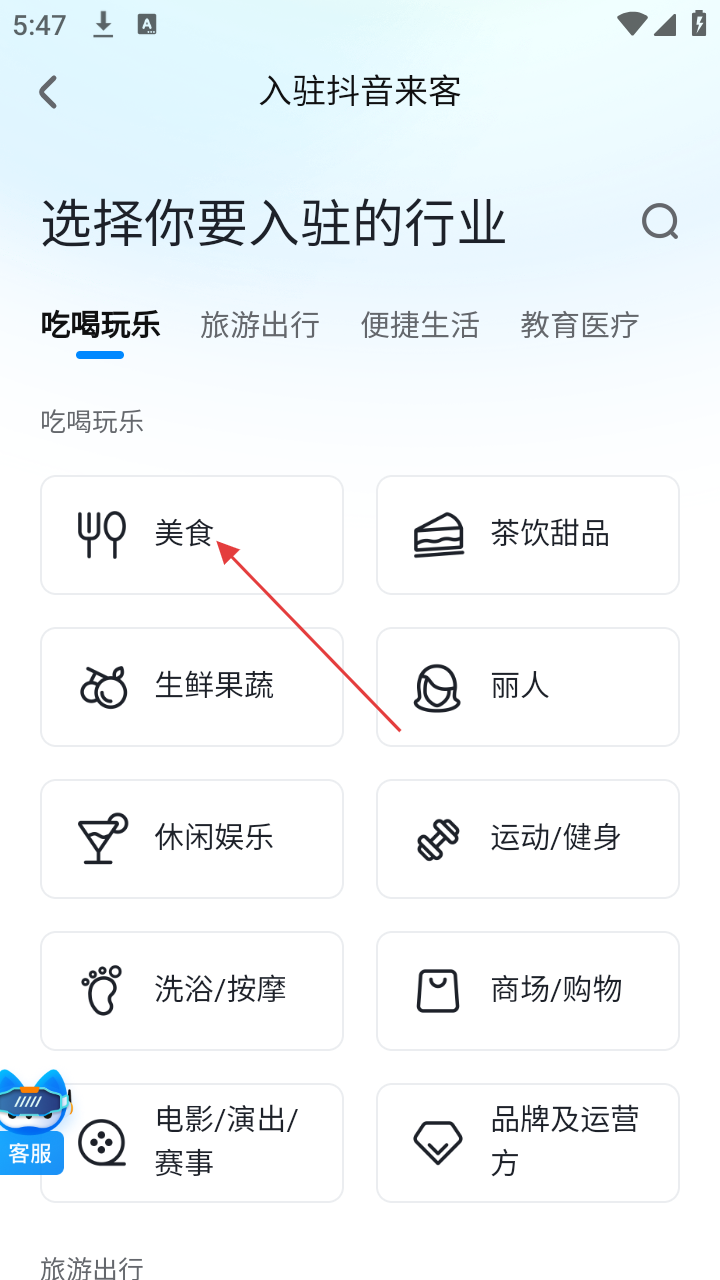 2、在选择入驻行业页面,点击【美食】选项,进入美食行业详情页面。