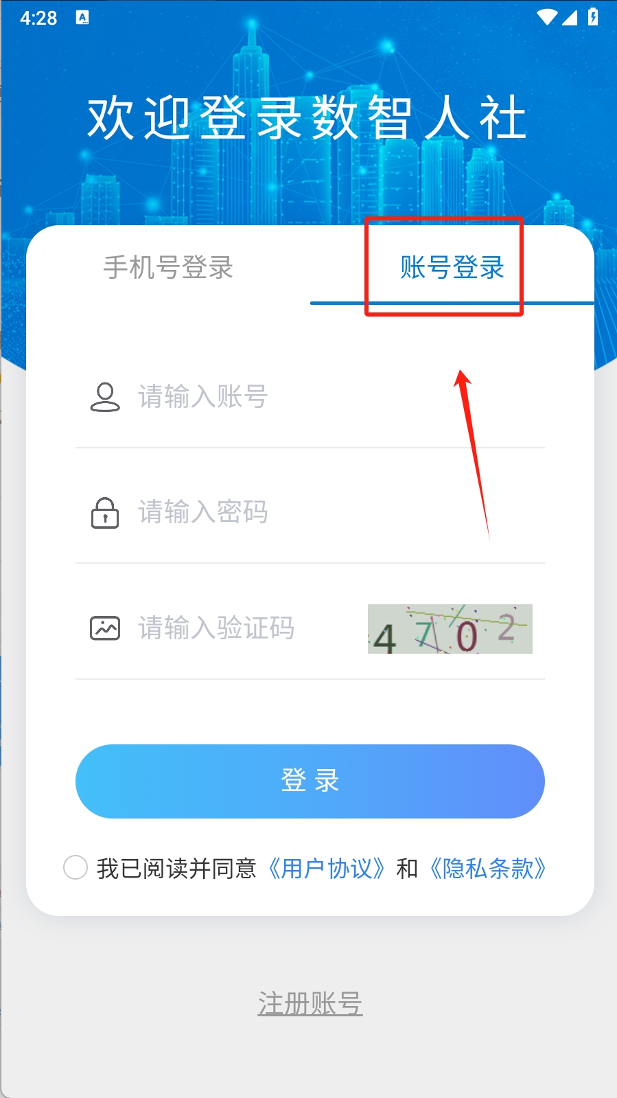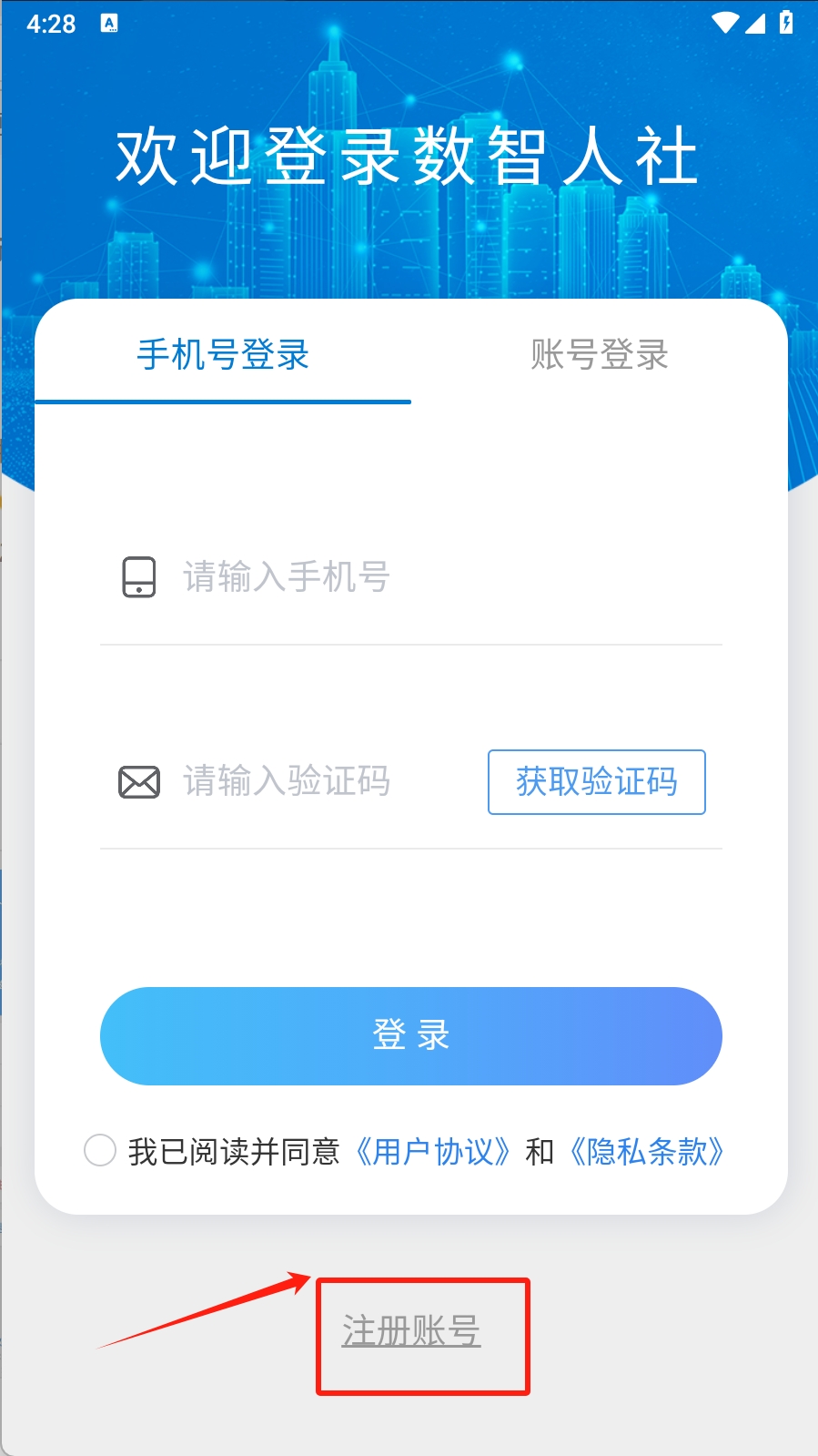 1、选择登录方式 、打开数智人社软件,选择“手机号登录”或“账号登录”选项,根据个人情况输入相应信息。
