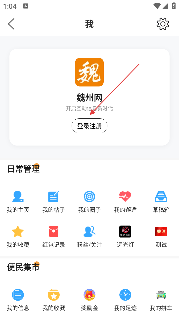 2、在“我”的页面,点击【登录注册】按钮,进入账号操作环节。