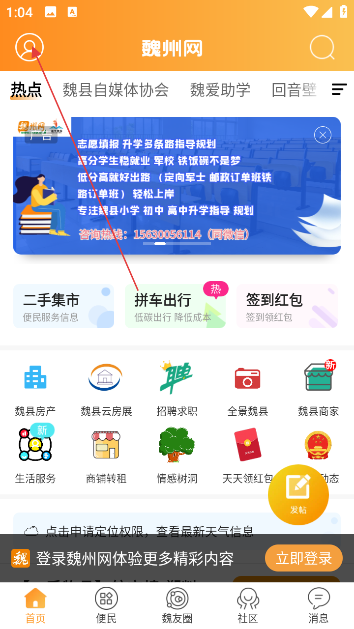 1、进入【魏州网】首页,点左上角头像,开启个人页访问流程。