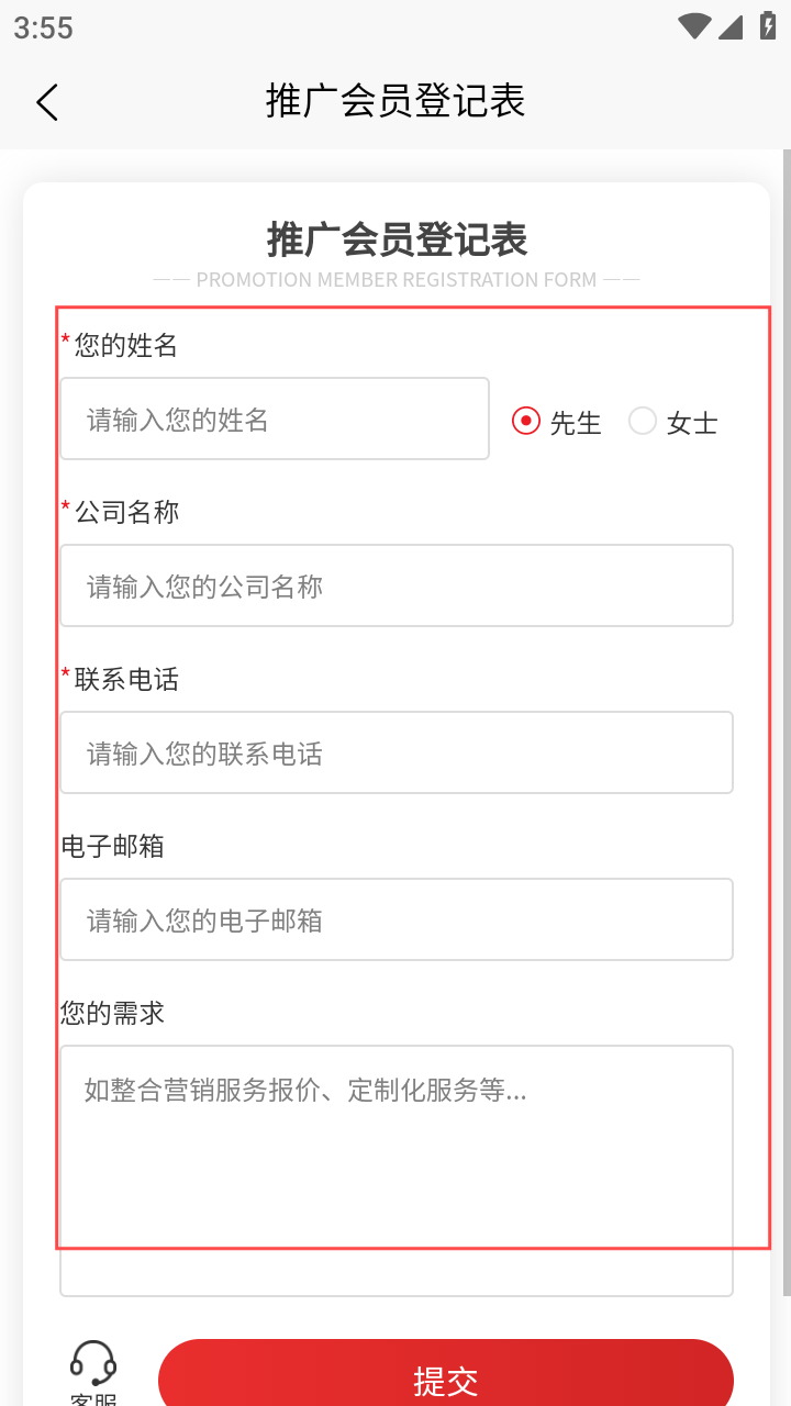 4、填推广会员登记表姓名、公司名、电话等,点【提交】完成申请。