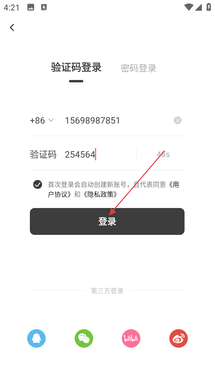 4、将收到的【验证码】填入输入框,勾选同意相关协议,点击【登录】完成操作。