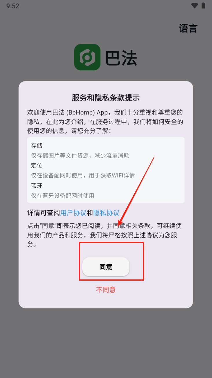 1、同意条款:点击“同意”按钮,接受服务和隐私条款。