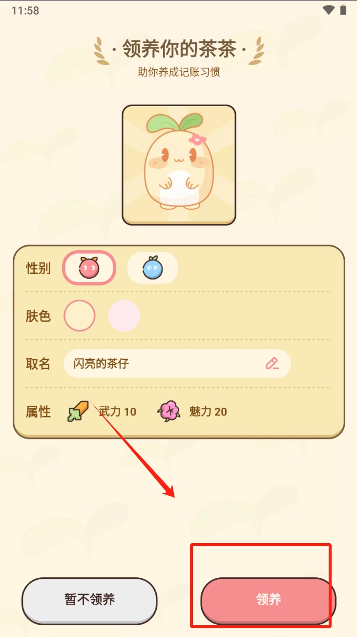 1、选择性别、肤色和名称,设置茶茶的属性后点击“领养”按钮。