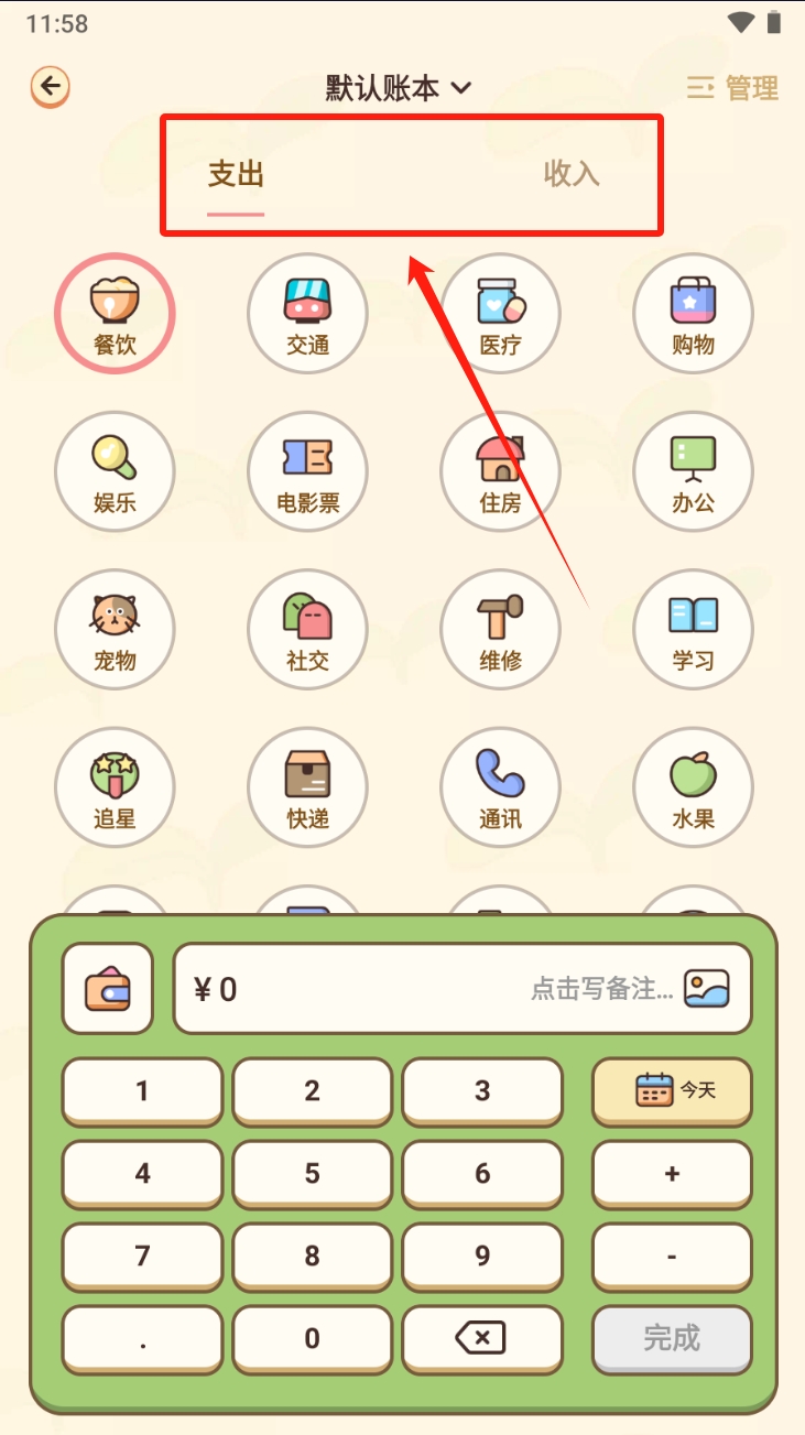 3、选择“支出”或“收入”,然后选择相应的分类进行记账。