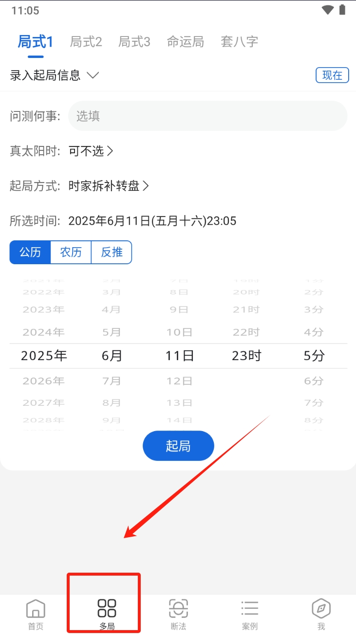 1、首先,进入起局界面。在软件首页,点击底部的“多局”按钮,进入起局信息录入界面,在这里可以输入起局的相关信息。