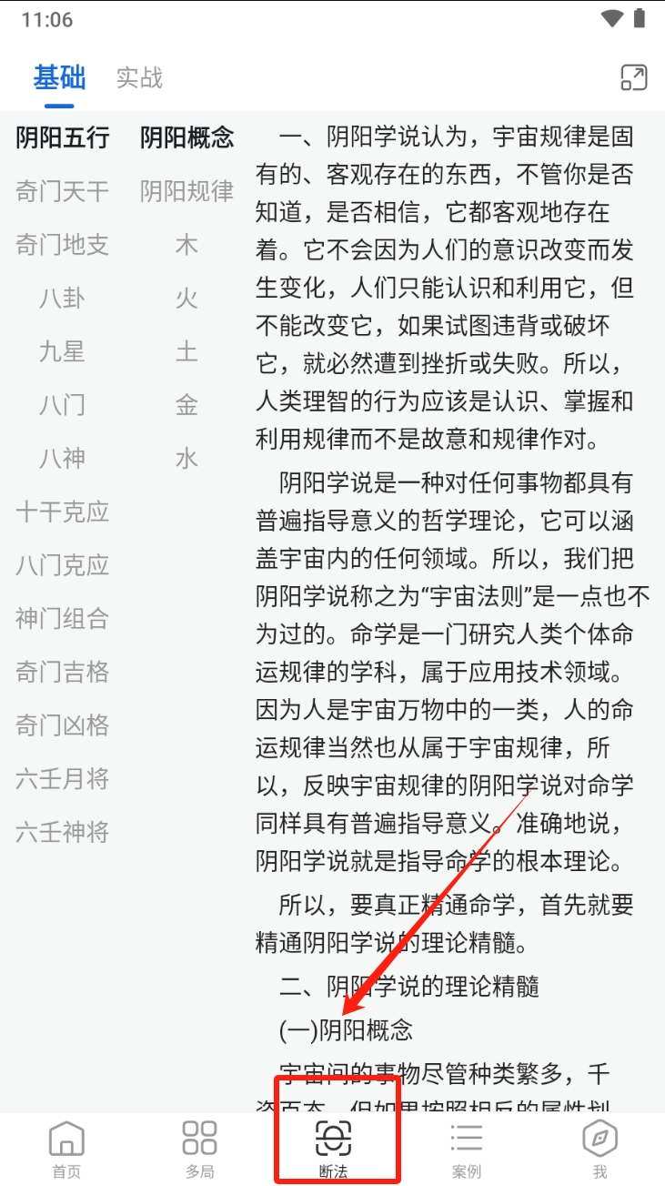 3、最后,学习阴阳五行知识。在软件首页,点击底部的“断法”按钮,进入阴阳五行知识学习界面,可以阅读和学习相关的理论知识。