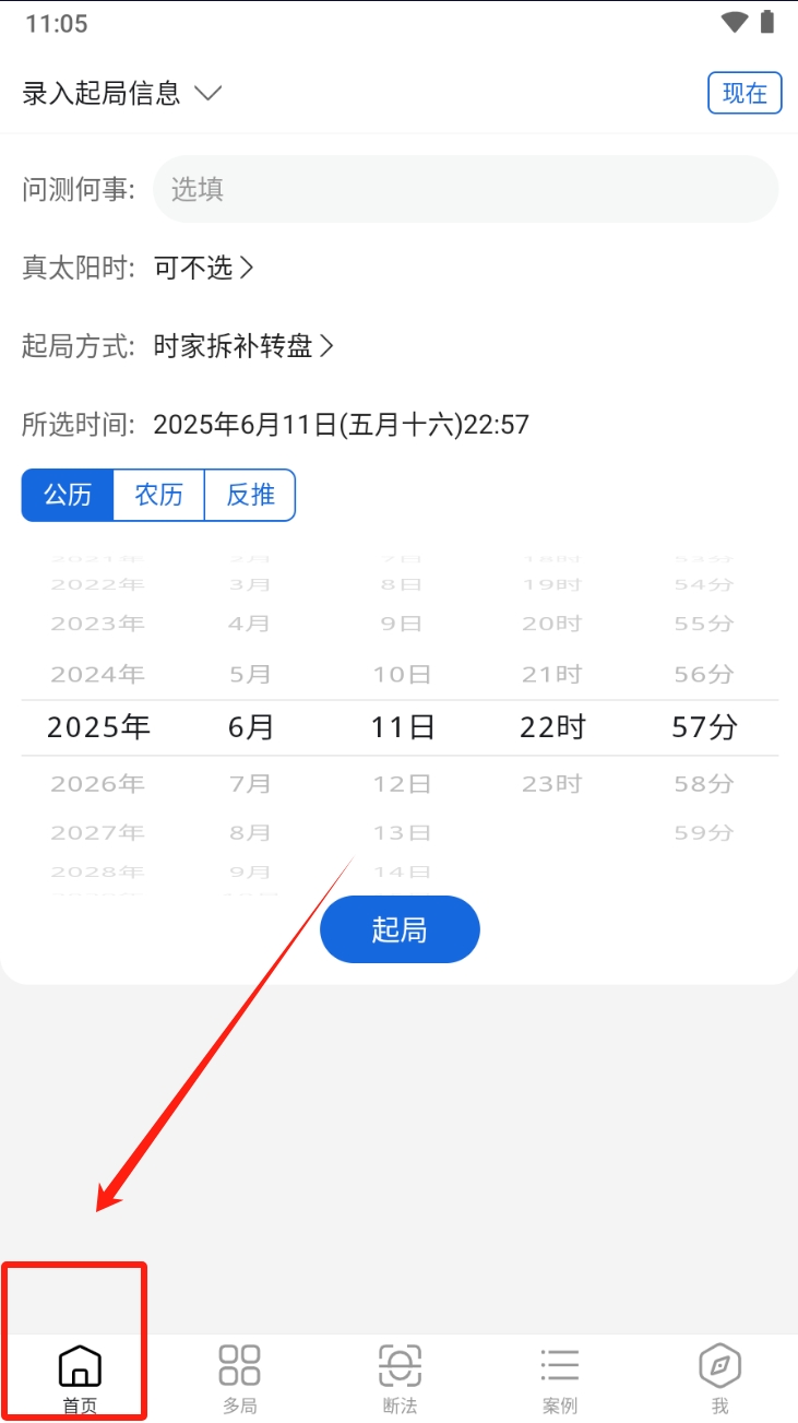2、其次,设置起局时间。在起局信息界面,选择所选时间,可以通过点击“公历”、“农历”或“反推”按钮来调整日期和时间。