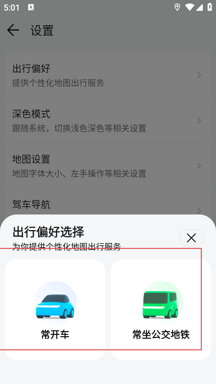 4、弹出出行偏好选择弹窗后,可选择【常开车】或【常坐公交地铁】,完成出行偏好设置。