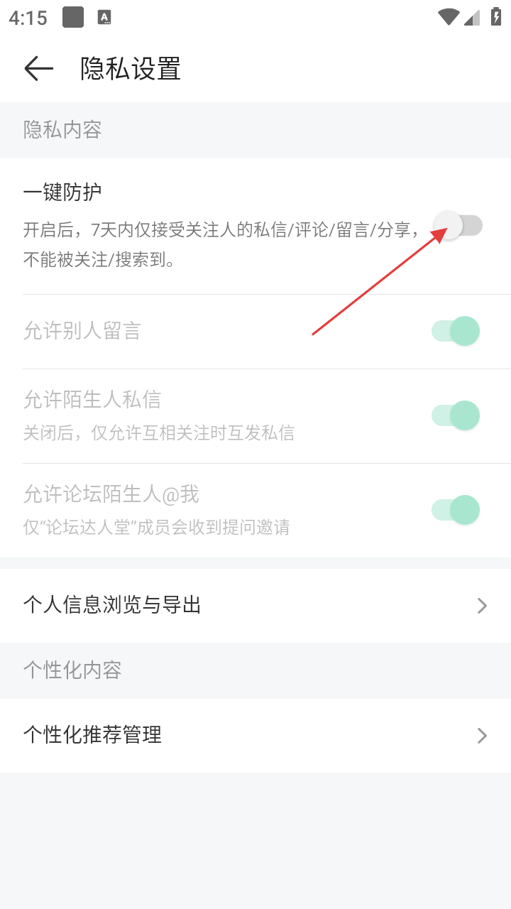 4、在隐私设置页面,可根据需求开启【一键防护】等功能,保护个人隐私安全。
