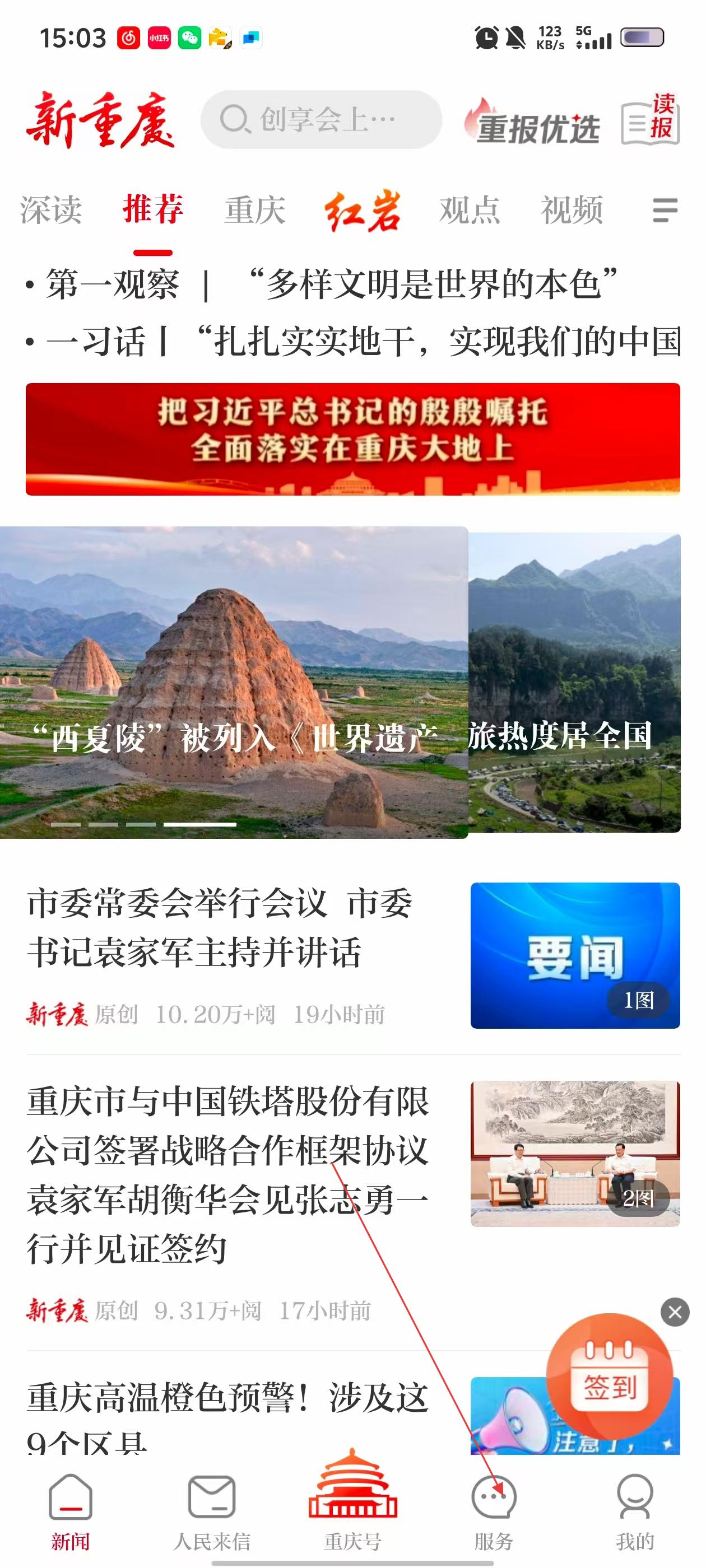 1、打开新重庆,进入应用首页面点击下方的【服务】,跳转至服务界面。