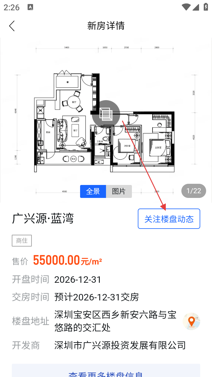 3、点击感兴趣的楼盘,进入新房详情页,可查看楼盘售价等信息,还能点击【关注楼盘动态】,可进入VR看房功能。